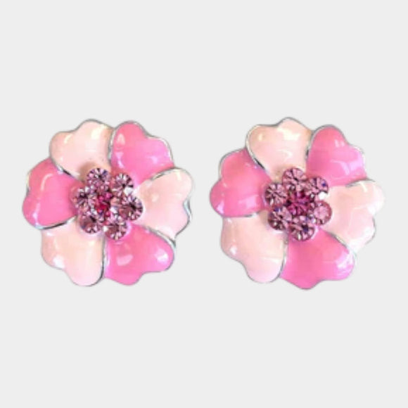 E012 Pink Flower w Pink Crystals in Middle stud
