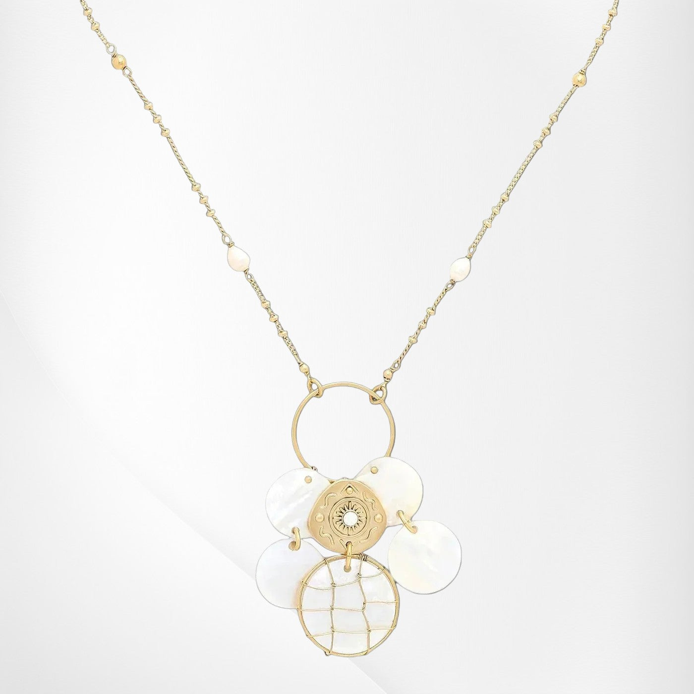 Playful yet elegant, the KIMBERLEY Multi-Disc Necklace features a series of delicately arranged discs that catch the light with every movement. This modern design blends texture and shine, creating a versatile piece perfect for both layering and solo wear.