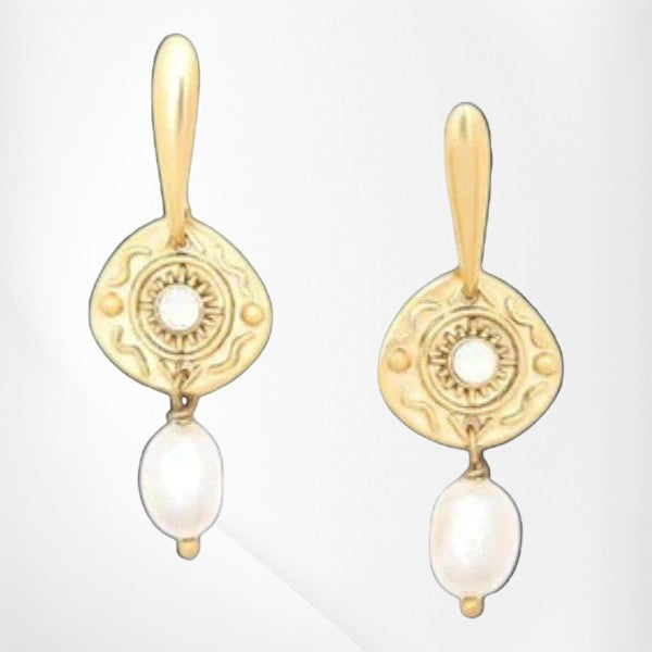 Delicate yet distinctive, the KIMBERLEY Post Earrings from Franck Herval blend earthy elegance with handcrafted charm. Each earring features a thoughtfully layered design with intricate metalwork, a subtle pop of colour, and a graceful freshwater pearl dangle that adds natural movement.