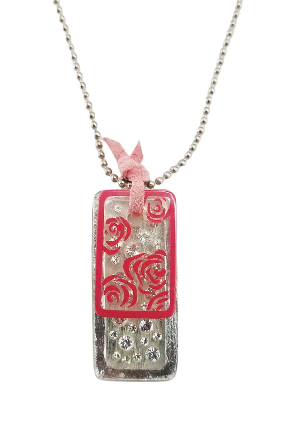 N049 Silver Leaf Necklace with Red Rosette
